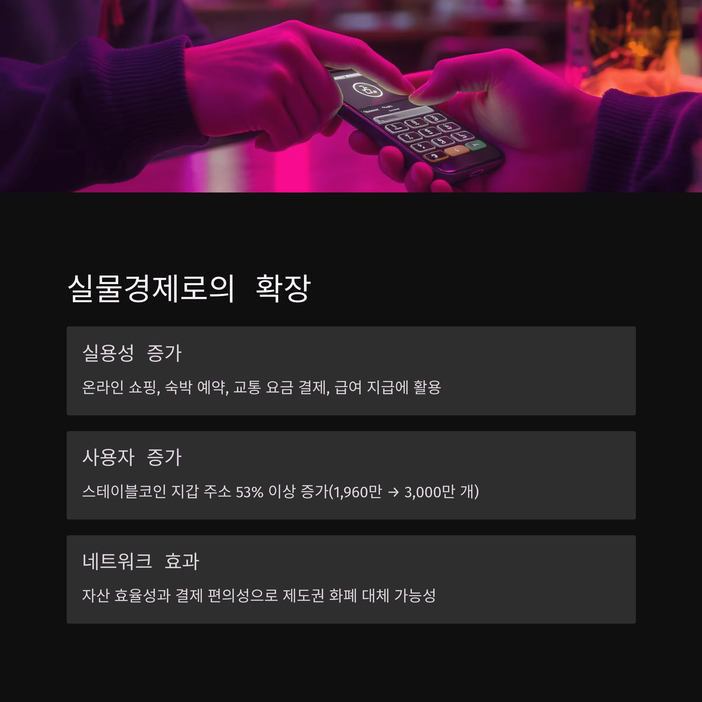 스테이블코인은 이미 실물경제와 결제 시스템에 침투하고 있으며, 정부 주도의 제도화 움직임이 활발해지고 있다.